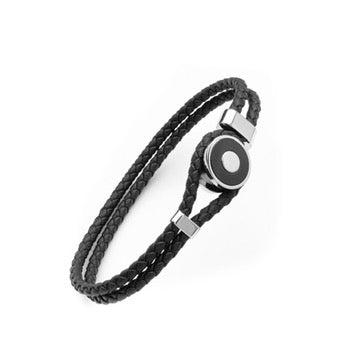 Dieses aus luxuriösem schwarzem Leder geflochtene Armband wird durch ein Emblem aus poliertem Edelstahl mit Hakenverschluss hervorgehoben. Ein eingraviertes Logo auf der Rückseite verleiht ihm eine raffinierte Note.
