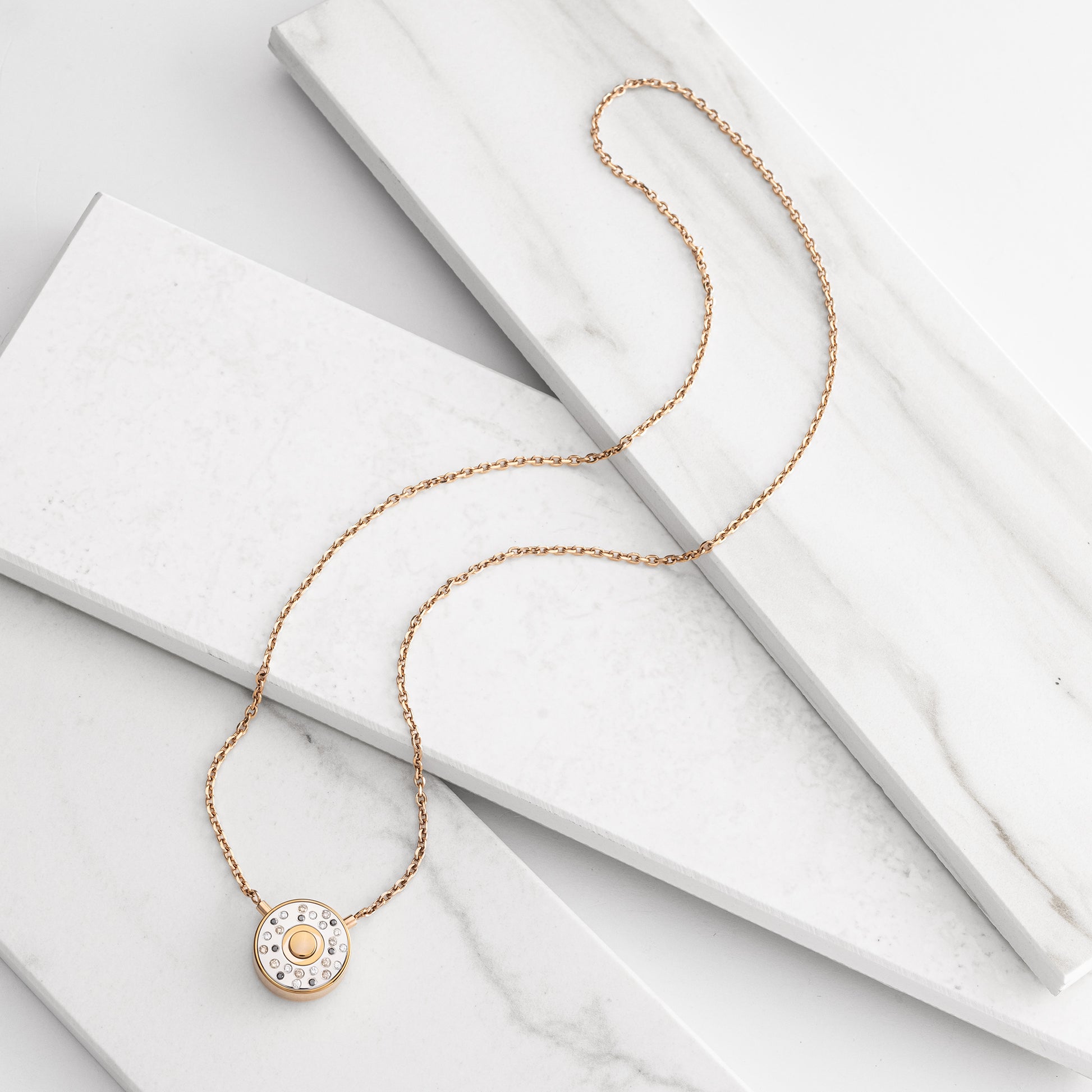 So unkompliziert der Verschluss ist, so raffiniert ist das PENDALOCK-Design. Das Herzstück der Marke ist eine Halskette mit einem Verschluss, der nicht nur ein kleines Detail an der Seite, sondern den Kern des Designs darstellt. Im wahrsten Sinne des Wortes. Als mittig platzierter Anhänger wird ein cleverer Mechanismus selbst zum Schmuckstück, das ultimativen Tragekomfort und zeitlose Eleganz bietet.